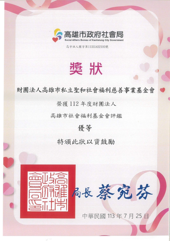 榮獲112年度財團法人高雄市社會福利基金會評鑑