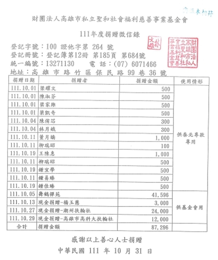 聖和基金會111年10月捐贈徵信錄
