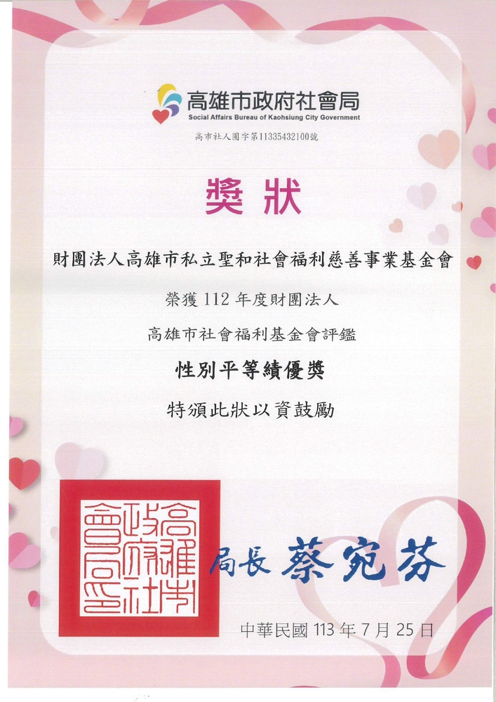 狂賀!!!!!財團法人高雄市私立聖和社會福利慈善事業基金會榮獲『性別平等績優獎』